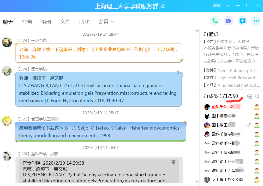 二是文献服务永不断线。上海理工大学图书馆学科服务群(微信群和QQ群),直接对接我校师生的需求,他们不会查的文献、查不到的文献,只要在群中提供标题,服务群会及时进行传递。据统计,寒假抗疫情期间,学科服务的QQ群、微信群共响应各类文献427篇,约19183页。其中期刊约224篇,来源于个97个刊;图书及学位论文44册,其他文献62篇。其间,微信群新增用户128人,QQ群新增用户207人。