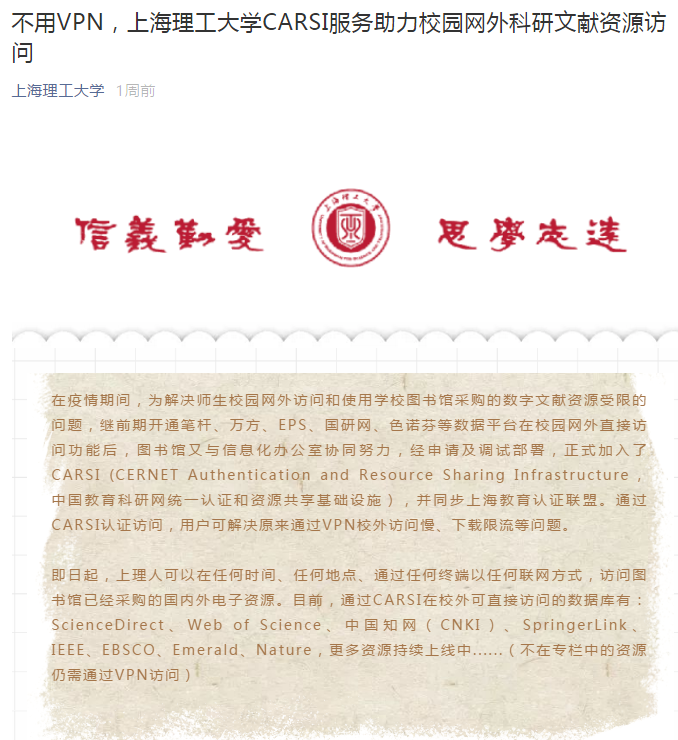 疫情期间,继开通笔杆网、万方、EPS、国研网、色诺芬等数据平台在校园网外直接访问功能后,在馆领导的果断决策下,图书馆又与信息化办公室协同努力,借助CARSI(CERNET Authentication and Resource Sharing Infrastructure,中国教育科研网统一认证和资源共享基础设施)服务升级契机,实现了CARSI与学校统一身份认证系统的对接,第一时间申请加入了CARSI,并同步上海教育认证联盟。通过CARSI认证访问,目前我校师生可直接访问学校ScienceDirect、Web of Science、中国知网(CNKI)、SpringerLink、IEEE、EBSCO、Emerald、Nature等中外文重要文献数据库,解决了长期以来校外须通过VPN访问这些数据库时速度慢、下载限流等问题,赢得了广大用户的交口称赞。